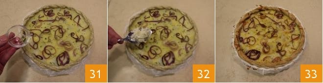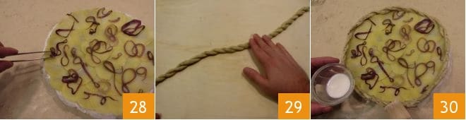Adicione também a cebola que você reservou 28, finalmente com as sobras da massa brisée faça 2 tiras do mesmo tamanho da forma, que você irá trançar 29 para criar uma corda; coloque a trança que você obteve ao redor da torta e pincele-a com o leite 30.