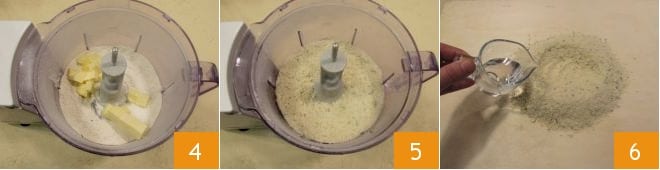 Acione as lâminas, depois adicione a manteiga em pedaços fria de geladeira 4. Bata tudo até obter uma mistura com aspecto arenoso e farinhento 5. Disponha a mistura sobre uma bancada e faça a clássica forma de fonte no centro. Adicione a água gelada aos poucos 6