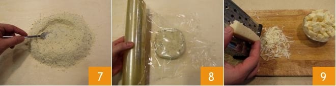 e comece a juntar a massa com um garfo 7; amasse rapidamente todos os ingredientes com as mãos para obter uma massa compacta e lisa; em seguida, forme um bloco, achate-o ligeiramente e deixe-o repousar por pelo menos 20-30 minutos na geladeira envolto em filme plástico 8. Agora dedique-se ao recheio: rale 60 g de queijo em ralo grosso e o restante corte em cubos de 3-4 mm e reserve 9.