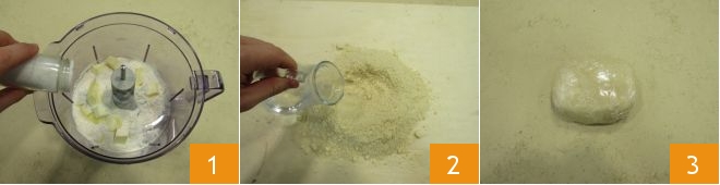 Para preparar a torta salgada de cogumelos e lentilhas, comece pela base de Massa brisée. No processador, coloque a farinha, a manteiga fria em pedaços, uma pitada de sal 1 e bata tudo até obter uma mistura arenosa. Transfira a mistura para uma bancada e amasse brevemente, adicionando, aos poucos, a água fria 2. Trabalhe o mínimo possível, para não derreter a manteiga, até obter uma massa compacta e elástica. Enrole o bloco de massa em filme plástico e deixe descansar na geladeira por pelo menos 40 minutos 3.