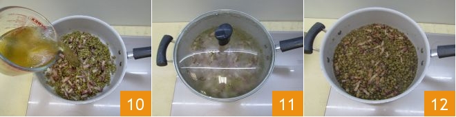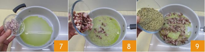 Em uma panela grande, coloque um pouco de óleo e cozinhe a chalota em fogo baixo 7 deixando-a suar por 7-8 minutos, lembrando de mexer de vez em quando. Em seguida, adicione o bacon e cozinhe por 3-4 minutos 8. Quando a base estiver bem cozida, adicione as lentilhas secas 9