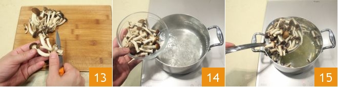 Limpe os cogumelos chiodini eliminando eventuais resíduos de terra 13 e depois escalde-os em água fervente por 15 minutos 14, escorra-os bem 15.
