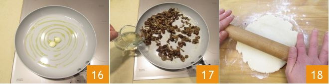 Enquanto isso, deixe o alho aromatizar em uma panela com um fio de óleo 16 e depois retire-o e refogue os cogumelos por 2-3 minutos, em seguida, adicione o vinho branco 17 e assim que evaporar, desligue o fogo e deixe esfriar completamente. Retome a massa brisè e abra a massa em uma bancada levemente enfarinhada até uma espessura de cerca de 0,5 cm 18,