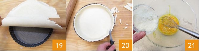enrole a massa no rolo e coloque-a dentro de uma forma perfurada (se não tiver, então unte e enfarinhe antes) 19; elimine os excessos de massa com uma faca 20. Em uma tigela grande, coloque os ovos e misture com o pecorino 21,
