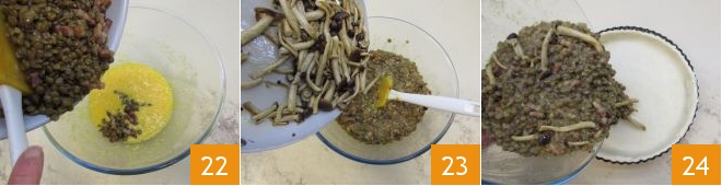 adicione as lentilhas 22 e os chiodini 23, ajuste o sal e a pimenta e, após misturar bem, despeje a mistura na forma 24.