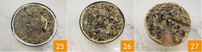Nivele 25 e asse em forno statico pré-aquecido a 200° por 30 minutos, depois abaixe a temperatura para 170° e asse por mais 20 minutos 26. Deixe esfriar antes de retirar da forma e depois sirva sua torta salgada de cogumelos e lentilhas 27!
