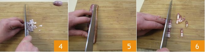 Enquanto isso, cuide do recheio, descasque e pique finamente a chalota 4. Depois, retire a pele do bacon defumado 5 e corte-o em tiras de meio centímetro 6.