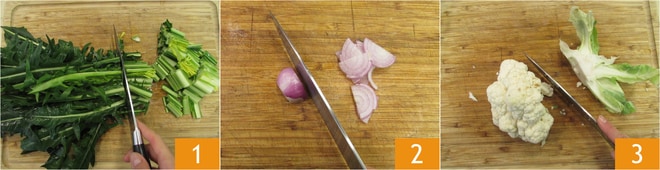 Para preparar a torta salgada de legumes na frigideira, limpe a chicória e elimine a parte inferior do talo, mais fibrosa, obtendo cerca de 340 g, depois corte os talos em pedaços de cerca de 2 cm 1 e as folhas em pedaços irregulares. Limpe e fatie a cebola 2. Retire as folhas externas da couve-flor, obtendo assim cerca de 260-270 g 3.