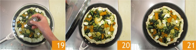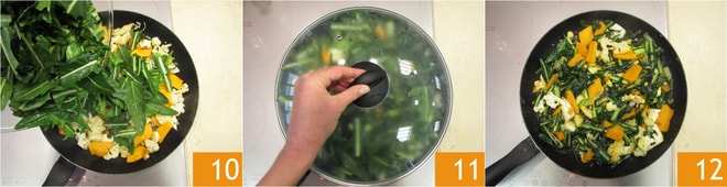 Por último, adicione aos outros legumes na frigideira também a chicória 10, cubra com uma tampa 11 e deixe cozinhar em fogo moderado por mais 5 minutos. Desligue o fogo e deixe esfriar 12.