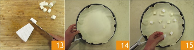 Corte o brie em cubos 13. Em uma frigideira de 22 cm de diâmetro, coloque a massa folhada redonda estendida 14. Recheie a base da massa: coloque na base alguns pedaços de brie 15.