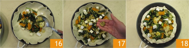 Adicione metade dos legumes cozidos 16, mais brie e metade das azeitonas 17. Finalize com os legumes restantes, cubos de brie restantes e as azeitonas restantes na superfície. Dobre as bordas da massa folhada sobre os legumes, criando uma borda 18 e leve ao fogo.