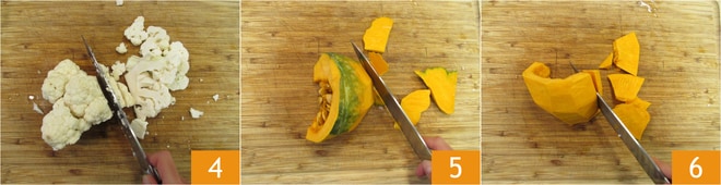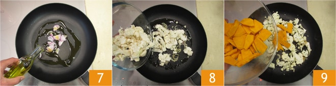 Coloque a cebola fatiada em uma frigideira grande, adicione um fio de óleo 7 e deixe refogar por cerca de 2 minutos. Adicione a couve-flor 8 e cozinhe em fogo alto por cerca de 3 minutos. Coloque na frigideira também a abóbora em fatias 9 e continue cozinhando em fogo alto por mais 3 minutos. Sal e pimenta a gosto.