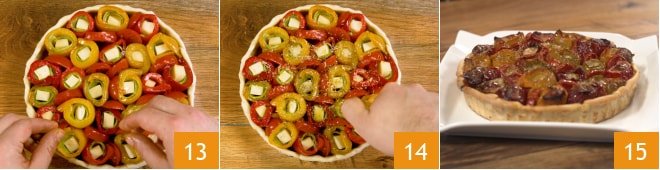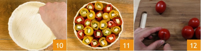 Unte e enfarinhe uma forma de 16 cm de diâmetro, coloque a massa brisée sobre ela e faça aderir bem ao fundo e às bordas. Fure o fundo com os dentes de um garfo 10. Coloque os pimentões na forma 11. Lave e corte os tomates Piccadilly em fatias 12.