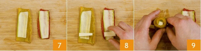 Monte os rolinhos: coloque sobre uma tábua uma fatia de pimentão, coloque por cima uma fatia de abobrinha 7 e termine recheando com uma tirinha de scamorza 8 que deve ser colocada em uma das extremidades. Enrole os pimentões 9 e reserve.