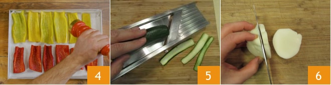 apimente 4 e tempere com um fio de azeite, depois asse em forno estático pré-aquecido a 200° por cerca de 25 minutos. Uma vez assados, retire os pimentões do forno e deixe esfriar. Lave e corte as pontas das abobrinhas, depois fatie-as finamente com um cortador 5. Corte a scamorza em fatias 6 e depois reduza-a a tirinhas.