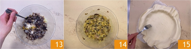 Junte o radicchio refogado 13 e misture bem até obter um composto homogêneo 14. Desenrole a massa folhada e forre uma forma de 22 cm de diâmetro, deixando no fundo o papel manteiga. Faça furos na base com um garfo, assim ela não vai inchar durante o cozimento 15.