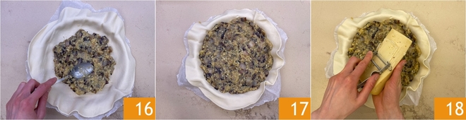 Despeje o recheio no interior 16 e nivele a superfície 17. Com um descascador, faça fatias finas de fontina 18.