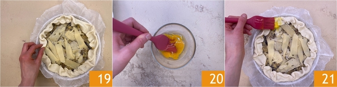 Dobre as bordas da massa para dentro 19, depois bata o ovo e pincele a borda da massa 21.