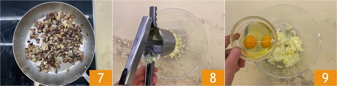 Deixe amornar e reserve 7. Em uma tigela, amasse as batatas cozidas com casca e ainda quentes 8, depois adicione os ovos 9.