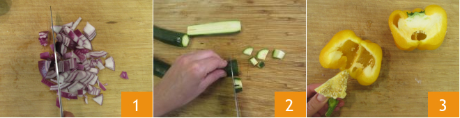 Lavem bem os legumes. Descasquem a cebola, cortem em fatias e piquem grosseiramente 1. Passem para a abobrinha, retirem as pontas e cortem primeiro ao meio e depois em cubos 2. Agora cortem ao meio o pimentão amarelo, removam as sementes e os filamentos internos 3.