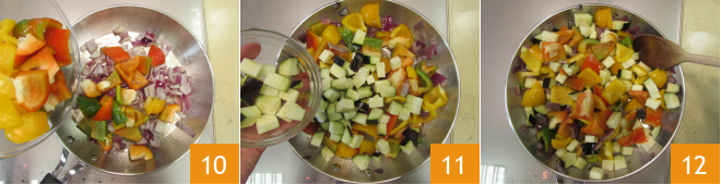 Acrescentem na frigideira os pimentões 10, as abobrinhas e as berinjelas 11. Misturem e deixem cozinhar por um par de minutos 12.