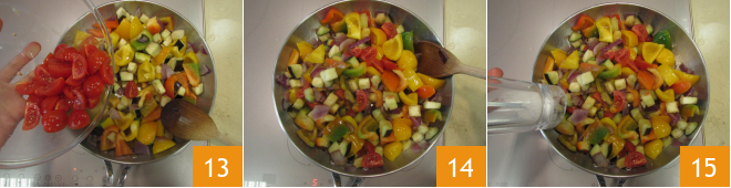 Acrescentem também os tomatinhos 13 e mexam novamente 14. Tempem com sal 15, pimenta