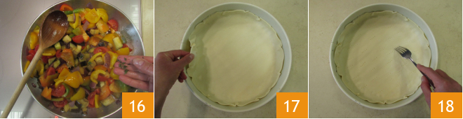e adicionem as folhinhas de tomilho 16. Cozinhem por mais 5 min em fogo alto. Os legumes devem ficar ainda crocantes. A partir daí desliguem o fogo e deixem esfriar por pelo menos 10 minutos. Desenrolem delicadamente a massa folhada e transfiram-na para dentro de uma forma de 28 cm 17. Piquem a base com os dentes de um garfo 18