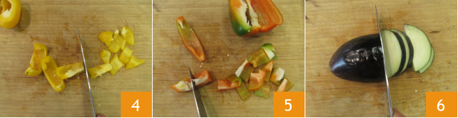 Cortem-no primeiro em tiras e depois em pedaços grandes de cerca de 2 cm 4. Façam o mesmo com o pimentão vermelho 5. Peguem uma berinjela, retirem as extremidades e cortem primeiro em fatias 6.