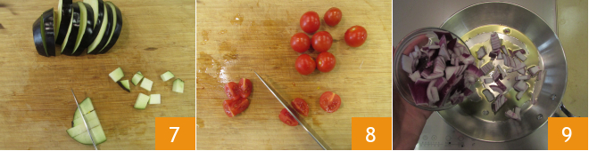 e depois em cubinhos 7. Cortem os tomatinhos em quartos 8. Coloquem em uma panela um fio de azeite, adicionem a cebola e deixem refogar por um par de minutos 9.