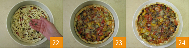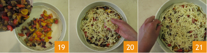 e coloquem os legumes já frios no interior 19. Acrescentem o Edamer ralado usando os furos maiores do ralador 20 e dobrem o excesso de massa das bordas para dentro, sobre o recheio 21.
