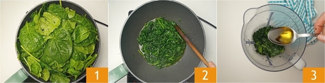 Para preparar a torta salgada de ricota e espinafre, primeiro deixe murchar na frigideira, em fogo baixo, os espinafres por 10 minutos com água 1. Deixe esfriar 2 e esprema bem. No copo do mixer coloque os espinafres e 10 g de óleo 3.