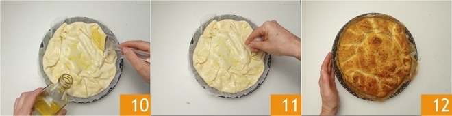 Sele bem as bordas, dobrando-as. Pincele a superfície com 10 g de azeite 10, distribua sal grosso 11 e asse em forno pré-aquecido ventilado a 190°C por 40 minutos na prateleira do meio, até dourar completamente. Deixe esfriar bem antes de cortar em fatias a torta salgada de ricota e espinafre 12.