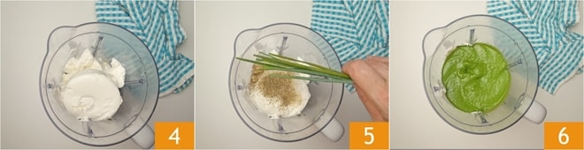 Adicione o queijo ralado, a ricota, previamente deixada a escorrer em uma peneira 4. Tempere com o sal, a pimenta e a cebolinha lavada e picada 5. Ligue o mixer e bata repetidamente até obter um creme liso e homogêneo 6.