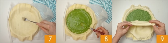Forre com papel manteiga uma forma de 24 cm de diâmetro, um rolo de massa folhada e faça furos no fundo com os dentes de um garfo 7. Despeje a mistura e nivele 8. Cubra com o segundo rolo de massa folhada, sempre furado 9.