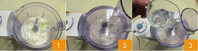 Para preparar a torta salgada, a primeira coisa a fazer é preparar a massa brisée: coloque a farinha junto com a manteiga cortada em cubos no recipiente de um mixer com lâminas 1 e bata tudo 2 até obter uma mistura arenosa. Em seguida, com o mixer ligado em velocidade moderada, adicione a água aos poucos 3.