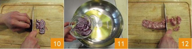 Corte a cebola em fatias finas 10 e transfira para uma panela onde já tenha colocado um fio de óleo 11. Deixe murchar e enquanto isso retire a pele da linguiça e corte-a com uma faca 12.