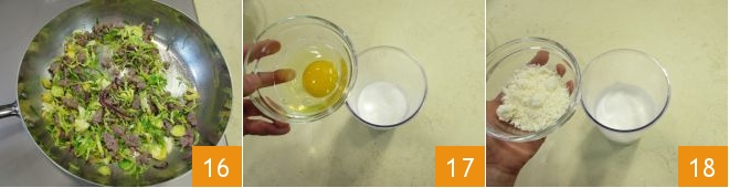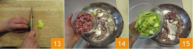 Lave e corte também as couves de Bruxelas em rodelas finas 13 e assim que a cebola estiver murcha, adicione a linguiça na panela 14. Mexa até que esteja bem dourada, então adicione as couves 15.