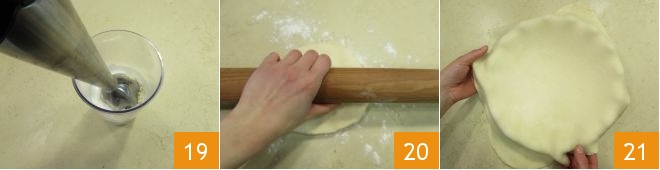 Bata tudo com um mixer de imersão 19 até obter um creme liso e reserve. Pré-aqueça o forno a 200° em modo estático, depois unte e enfarinhe uma forma de 24 cm: escolhemos usar uma de cerâmica, mas você pode usar uma clássica. Retome a massa brisée e abra com um rolo 20 até obter uma espessura de meio cm. Transfira a massa para dentro da forma 21 e pressione levemente com os dedos para aderir.