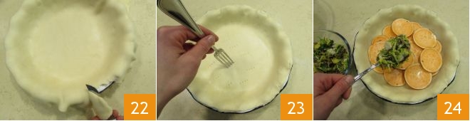 Com uma faca, elimine o excesso de massa das bordas 22 e com um garfo fure a base 23. Coloque uma primeira camada de batatas e adicione a mistura de linguiça e couves de Bruxelas 24.