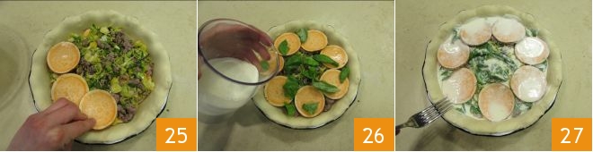 Disponha as fatias de batatas restantes apenas ao redor 25, deixando um espaço vazio no centro. Adicione as folhinhas de manjericão, quebrando-as com as mãos e tempere com sal e pimenta. Em seguida, despeje o molho royale espalhando uniformemente sobre o recheio 26 e usando um garfo, faça um desenho na borda 27.