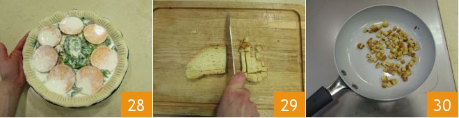 Neste ponto 28, asse em forno estático pré-aquecido a 200°, na prateleira mais baixa, por cerca de 35 minutos. Depois, mova a forma para o centro do forno e asse por mais 20 minutos. Enquanto isso, corte o pão em cubos pequenos 29 e toste-os na panela com um fio de óleo 30.
