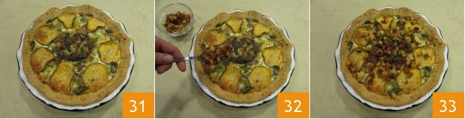 Assim que a torta salgada estiver cozida e bem dourada, retire do forno 31 e complete com os croûtons 32 antes de servir 33.