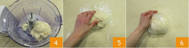 Assim que tiver obtido uma mistura uniforme 4, transfira a massa para uma superfície ligeiramente enfarinhada e trabalhe por alguns instantes 5. Neste ponto, embrulhe em filme plástico 6 e deixe descansar por cerca de 30 minutos na geladeira.