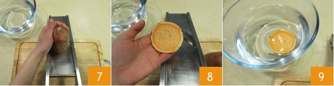 Enquanto isso, prepare o recheio. Lave bem as batatas-doces e, sem descascá-las, corte-as em fatias bem finas usando um mandolin (7-8); vá transferindo-as para uma tigela cheia de água para não oxidarem 9.