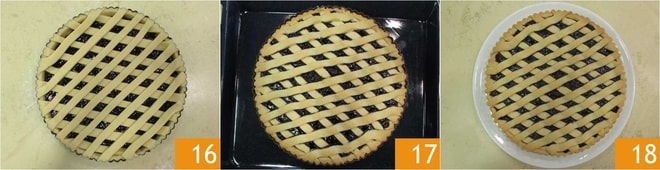 Com uma faca, corte tiras com cerca de 1 cm de largura 13 e disponha-as sobre a torta tanto em um sentido quanto no outro 14, depois elimine o excesso passando o rolo de massa nas bordas da forma 15.