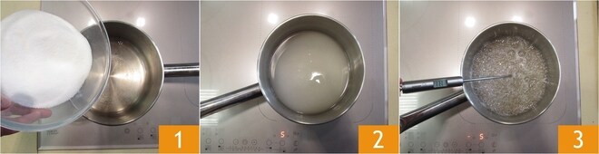 Para preparar a torta semifreddo, comece com o merengue. Coloque em uma panelinha a água e o açúcar, deixando de lado alguns colheres de sopa 1. Aqueça em fogo médio 2 e monitore sempre a temperatura com um termômetro de cozinha 3. O xarope deve atingir 121°C.