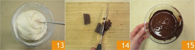 Você deve obter uma mistura lisa e bem montada 13. Cubra com filme plástico e leve à geladeira até o uso. Agora ocupe-se com o chocolate: pique grosseiramente 400 g de chocolate 14 e derreta em banho-maria ou no micro-ondas 15.