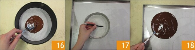 Enquanto isso, forre uma forma de aro removível de 20 cm com papel manteiga na base e com uma tira de acetato nas bordas. Despeje dentro 4 colheres de sopa de chocolate e, com a ajuda das costas da colher, espalhe por toda a base 16. Coloque na geladeira. Prepare agora os outros discos, no total serão necessários 5. Desenhe no papel manteiga 5 círculos de 18 cm com um lápis, ajudando-se com um aro de confeitaria 17. Vire o papel manteiga sobre uma assadeira e despeje 2 colheres de sopa de chocolate para cada círculo. Espalhe o chocolate sempre usando as costas da colher 18.