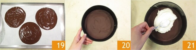 Depois de obter 5 discos de chocolate, leve-os à geladeira e espere que estejam bem firmes 19. Quando o chocolate estiver solidificado, pegue a forma 20 e coloque dentro uma camada de creme 21.