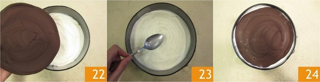 Posicione um disco de chocolate 22 e continue dessa forma, alternando o creme 23 com os discos. Você deve terminar a sobremesa com uma camada de chocolate 24. Cubra com filme plástico e coloque no freezer por pelo menos 6 horas.